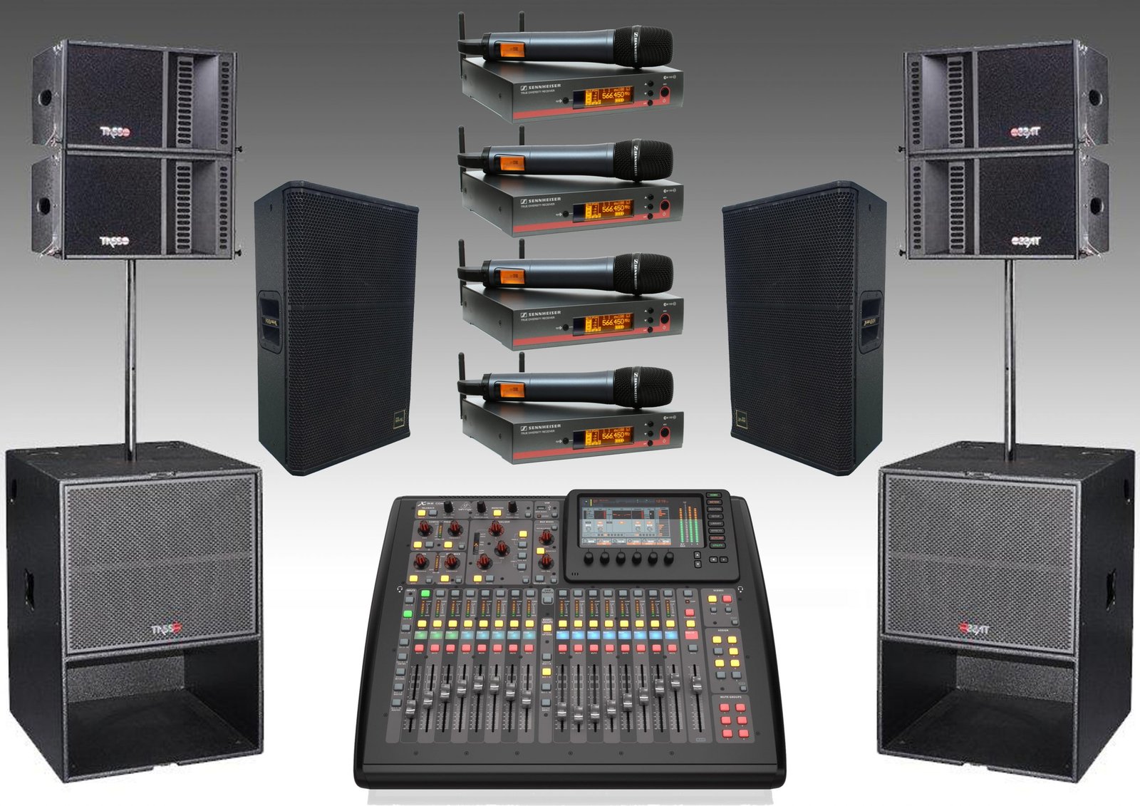 Về cơ bản, hệ thống âm thanh sẽ có 3 loại loa cơ bản là: loa full (đánh ra 3 giải tần là âm bass, âm mid và âm treble) – loa sub (hỗ trợ giải âm bass, giúp tròn tiếng và hay hơn) – loa monjtor (loa đánh ngược lên sân khấu để giúp người biểu diễn nghe rõ âm thanh).