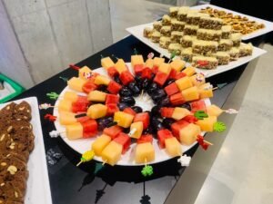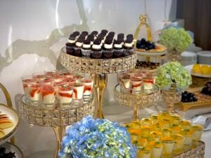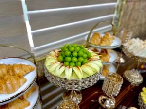 Teabreak thường bao gồm các món như bánh mặn – ngọt, trái cây, trà, cà phê, nước ép… được trình bày đẹp mắt trên bàn buffet.